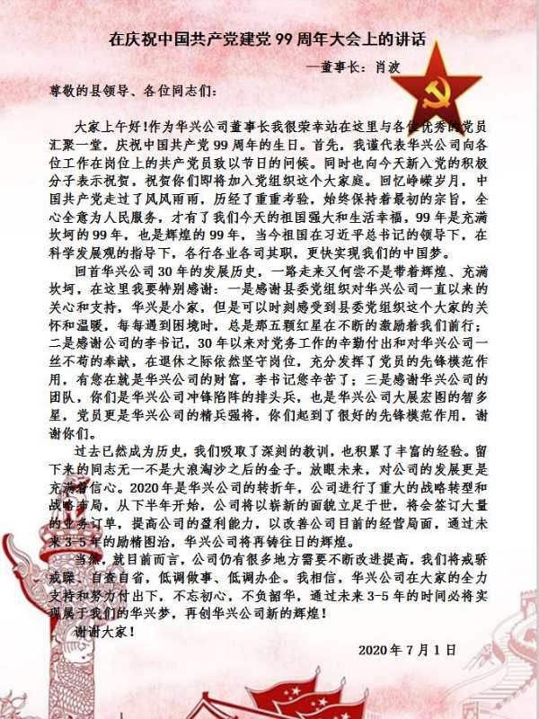 在慶祝中國共產(chǎn)黨建黨99周年大會上的講話——董事長:肖波
